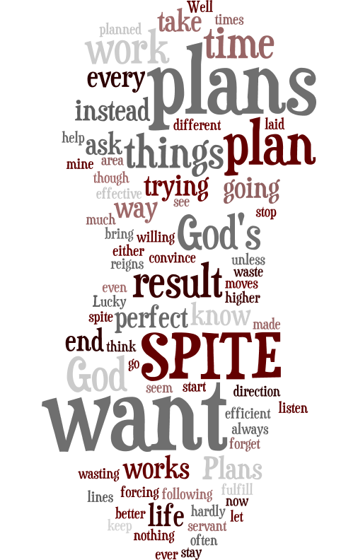 “My Plans” are nothing unless they are “God’s plans”. If they work out the way I want, it is IN SPITE OF ME, not because of me. If they work out at all for the result I want, it is IN SPITE OF ME, not because of me. I have to take time to stop, ask, and listen to His Plans instead of trying to convince Him my plans are better.