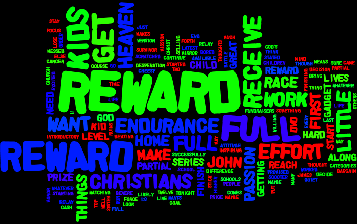 Whatever the reward, it is all tied to the level of effort that the child puts forth and the endurance with which they continue the effort. As Christians, we are the same as those little children. We can live our lives with endurance and stay focused and we will receive our FULL REWARD in Christ. Or we can do, as many Christians do, and serve God, not with focus and endurance, but allowing other things to be first in our lives, or when it is convenient, or with full force that we burn out before we finish. Those Christians will receive a PARTIAL REWARD in Heaven, but not the full reward that is available to them if they earn it. And then there are those Christians who will make a decision that will get them to Heaven, but will not make any effort to work for God’s kingdom. While I can’t say Heaven isn’t a reward, they will have NO REWARD in the full reward God promised.