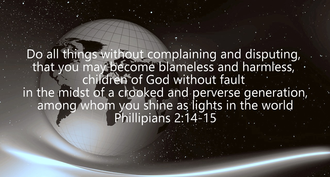 Philippians 2:14-15 gives the command to do everything without complaining and fighting, so that way we can remain blameless and not cause harm because we are God’s light in the world.