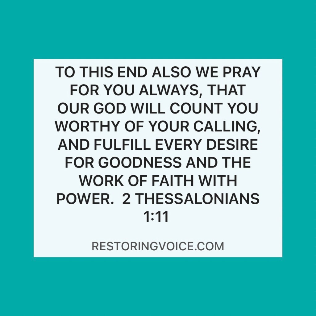 “To this end also we pray for you always, that our God will count you worthy of your calling, and fulfill every desire for goodness and the work of faith with power,”. 2 Thessalonians 1:11
