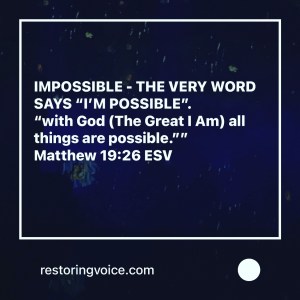 One of the names of God is The Great I Am (Exodus 3:14). With God (I Am) all things are possible. The very word declares I’m possible.