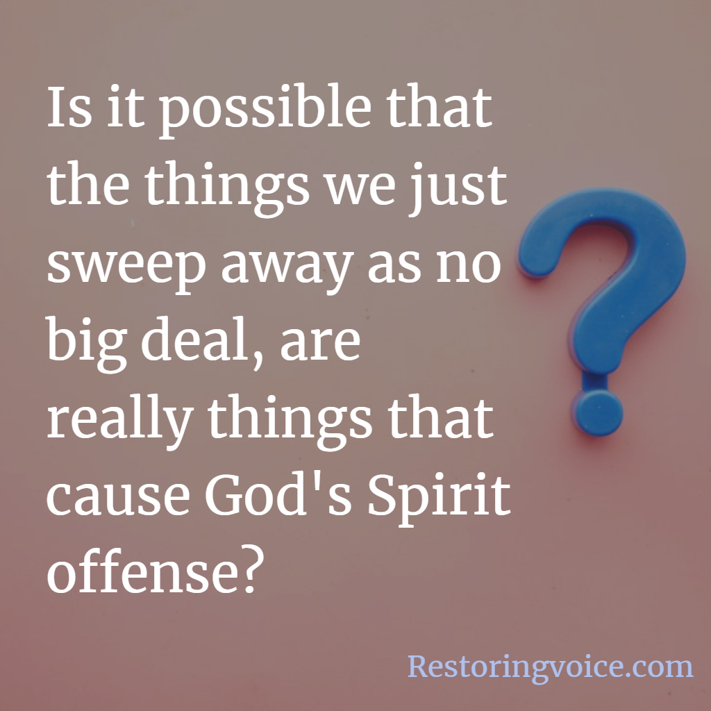 I have known the power of the tongue and the importance of not allowing the enemy a foothold in my life. but reading these scriptures and meditating on them. I felt this question rise up in my spirit. Is it possible that the things we just sweep away as no big deal are really things that cause God’s Spirit offense?